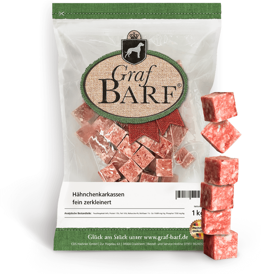 Bei unseren Hähnchenkarkassen haben wir ein ideales Verhältnis zwischen Fleisch, Knochen und Fett. Dank des hohen Phosphorgehalts wird der natürliche Knochenbau des Hundes zusätzlich unterstützt. Die Karkassen werden fein zerkleinert, daher besteht hier keine Gefahr des Verschluckens großer Knochenstücke. Die Hähnchenkarkassen werden feinst zerkleinert in große Blöcke gefroren und dann in Würfel geschnitten. Einzelfuttermittel für Hunde