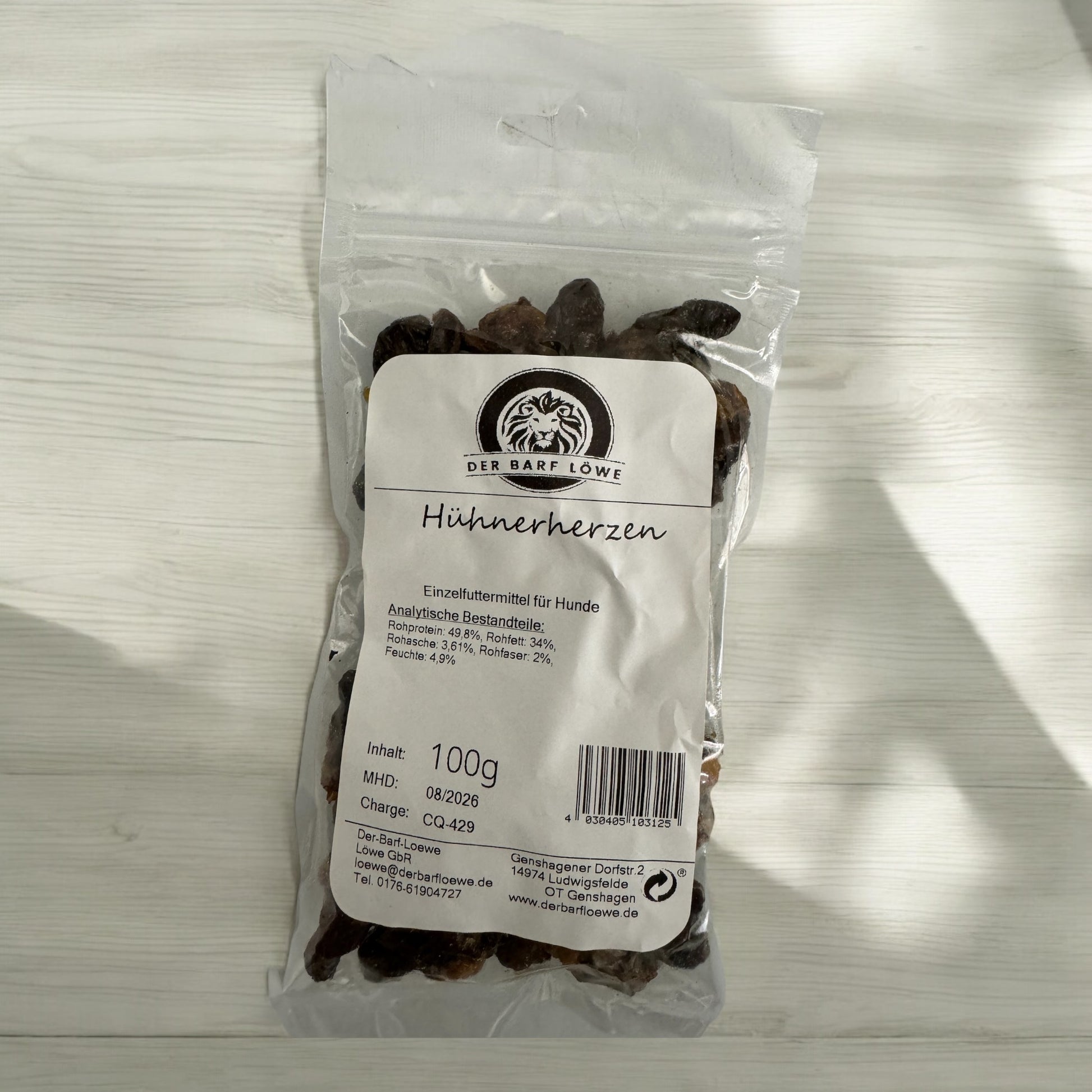 Unsere getrockneten Hühnerherzen sind ein toller, natürlicher und gesunder Snack der auch als Leckerli geeignet ist.