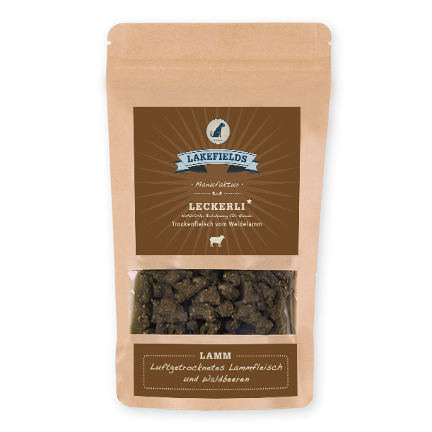 Unsere Lakefields Leckerlis Trockenfleisch vom Lamm sind ein gesunder Snack für unterwegs, für den kleinen Hunger zwischen den Hauptmahlzeiten und eignen sich natürlich auch super als Belohnungshappen. In unserer handlichen Leckerli-Dose lassen sich die Snacks ganz praktisch überall hin mitnehmen. Für die Leckerlis der Sorte Lamm verarbeiten wir 90% Lammfleisch aus regionaler, artgerechter Tierhaltung, 8% Kartoffeln aus lokalem Anbau und 2% Waldbeeren.