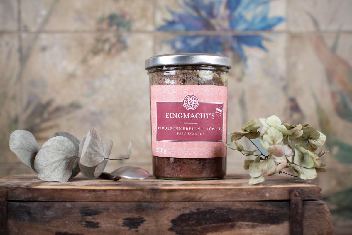 Für unser Eingmachts-Baukastenprinzip gibt es nun das Innereien-Töpferl vom Rind mit ausgewogen aufeinander abgestimmten Innereien vom schlachtfrischen Rind, von Hand eingekocht: