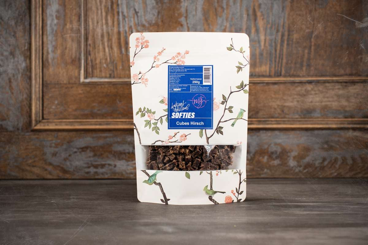99% Hirsch luftgetrocknet, eine Prise Meersalz und 1% kaltgepresste pflanzliche Öle machen unsere soften Cubes aus, die sich perfekt fürs Training eignen und als kleiner Snack zwischendurch.